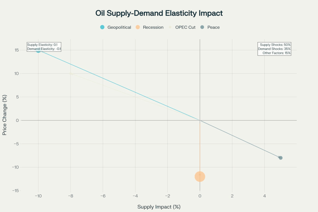 This elasticity framework explains why geopolitical shocks produce such pronounced price volatility. With supply and demand curves that are relatively steep, even modest shifts in either schedule generate significant price movements. Analysis shows that supply shocks account for approximately 50% of oil price fluctuations, while demand shocks contribute 35%, with the remainder attributed to other factors including geopolitical risk premiums.