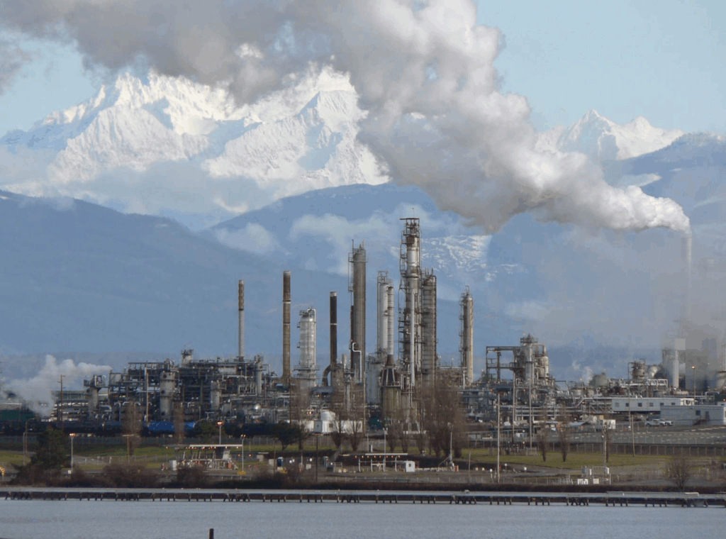 An oil refinery with multiple stacks releasing plumes of steam, set against a backdrop of snow-capped mountains.
